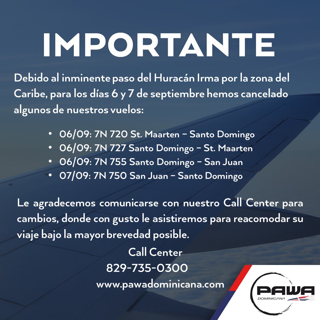 No obstante, Pawa Dominicana aclaró que no será responsable de ningún gasto en que pueda incurrir el pasajero dado el cambio de su viaje ocasionado por el fenómeno atmosférico.